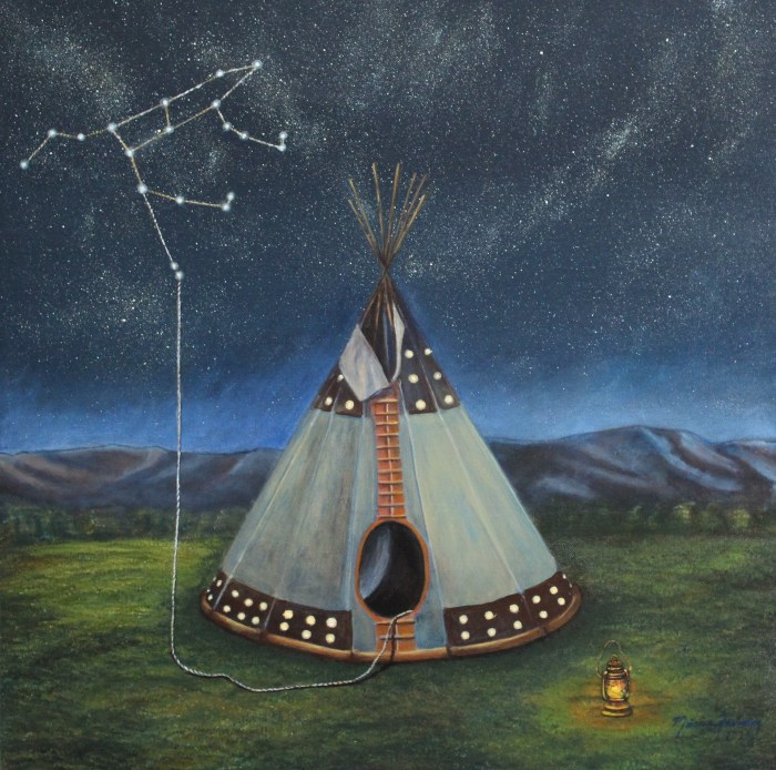 Éste es un tipi del cambio o del nacimiento, afuera, en sus paredes de tela tiene el símbolo de las estrellas, adentro del tipi se está tejiendo la nueva historia con un hilo de estrellas de la constelación de la Osa Mayor, afuera hay una lámpara que se encuentra lista para iluminar el camino de la vida.