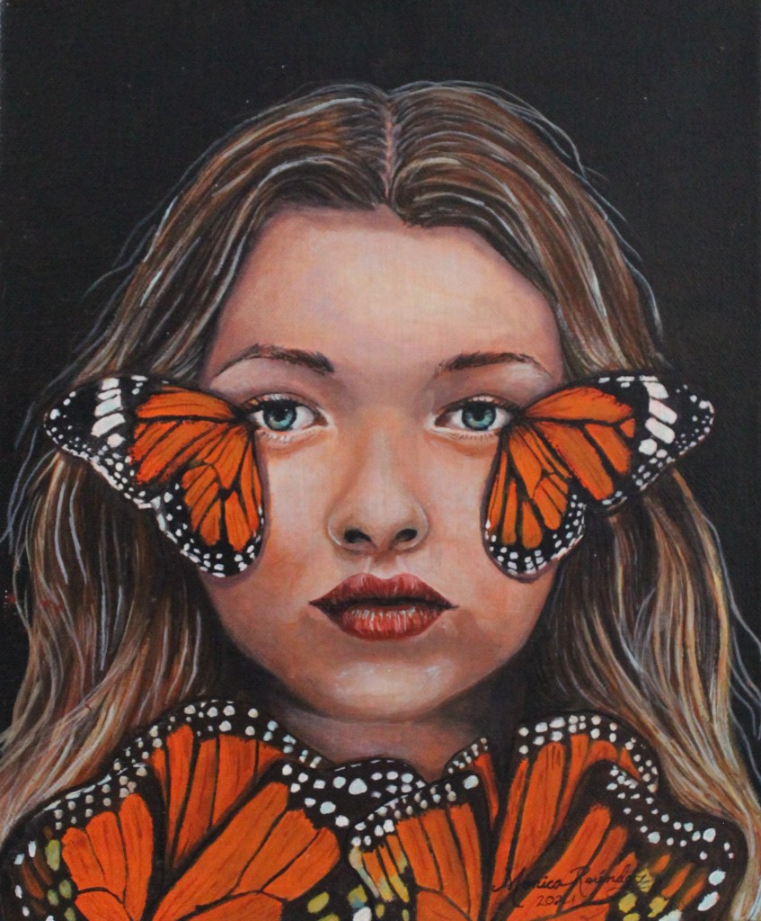 En ésta obra quiero representar los cambios que podemos empezar a tener sobre la percepción de las cosas, cada que vivimos un evento o circunstancia en nuestras vidas adquirimos la experiencia y el conocimiento que ha de quedar interiorizado en la memoria y en nuestros comportamientos. A éste personaje cada que hay una nueva experiencia le nacen unas alas de mariposas de los ojos que transforman su percepción del mundo, éstas alas caerán de sus ojos y se acumularán junto a otras las otras alas de mariposas que un cúmulo de experiencias adquiridas.